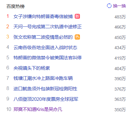 1.女子涉嫌向特朗普寄毒信被捕 猎头热点热度483万