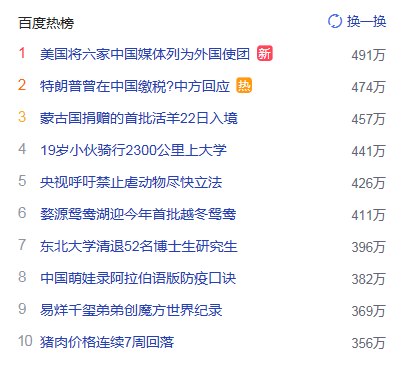 1. 美国将六家中国媒体列为外国使团 猎头热度热点491万