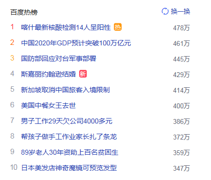 1. 喀什最新核酸检测14人呈阳性 猎头热度热点478万