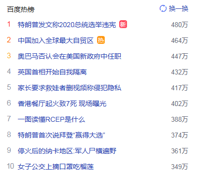 1. 特朗普发文称2020总统选举违宪 猎头热度热点480万