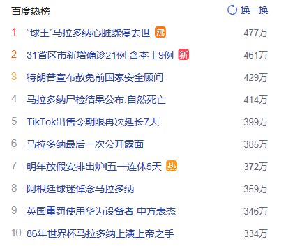 1. “球王”马拉多纳心脏骤停去世 猎头热度热点477万