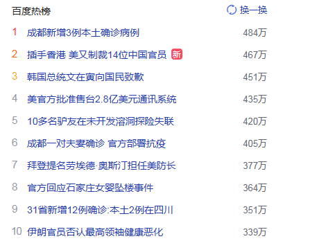1. 成都新增3例本土确诊病例 猎头热度热点484万